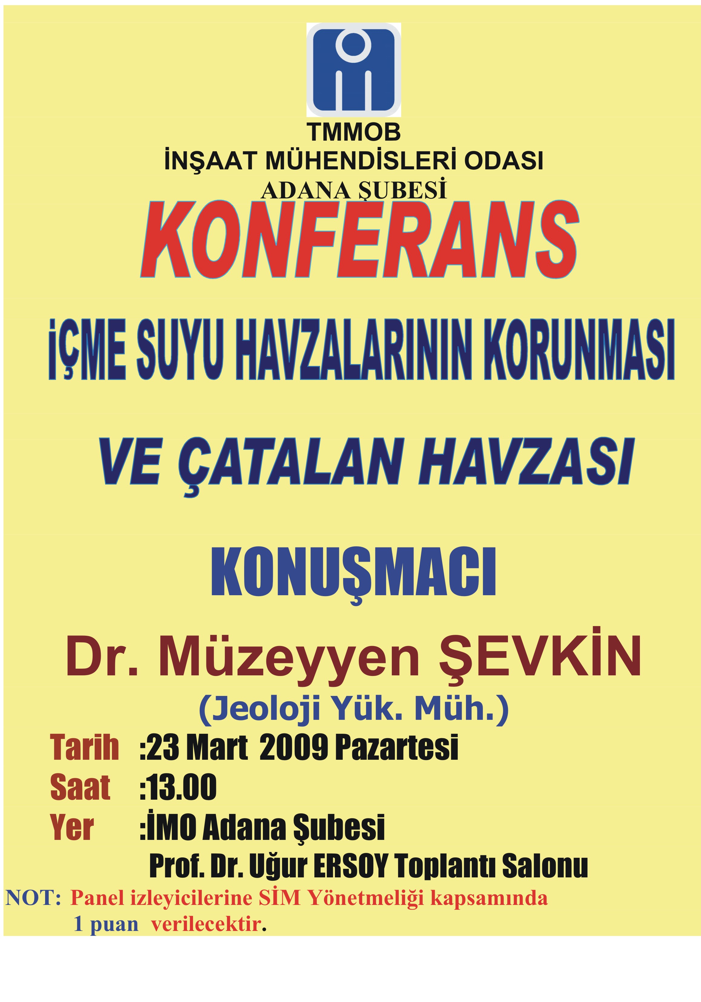Dünya Su Günü kutlamalarına Adana‘nın temel sorunu olan içme suyu havzalarının korunması konusunda dikkatleri çekmek ve yetkilileri uyarmak amacıyla İÇME SUYU HAVZALARININ KORUNMASI VE ÇATALAN HAVZASI KONFERANSI, Şube Yönetim Kurulu Üyemiz 2. Başkan Dr. Müzeyyen ŞEVKİN tarafından sunulmuştur.