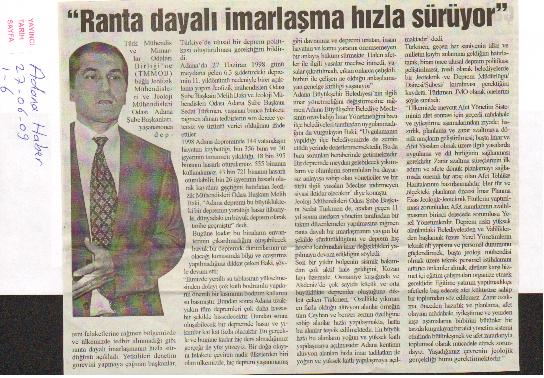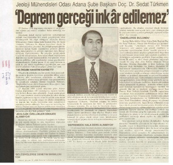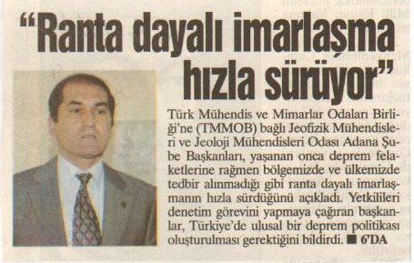 Yerel seçimler öncesi hiç bir belediye başkan adayının deprem politikasının olmadığını ne yazık ki gördük. Oysaki son bir yıldır bölgemiz sismik bakımdan çok aktif hale gelmiştir. Kozan fayı üzerinde, Osmaniye kuşağında ve Akdeniz de çok sayıda küçük ve orta büyüklükte depremler oluşmaktadır. Ancak deprem hasarları bakımından en büyük rolü oynayan zemin cinsi yani jeolojik özellikler ne yazık ki hala dikkate alınmamaktadır. Özellikle yıkımın en fazla olduğu alüvyon alanlar örneğin tüm Ceyhan ve benzer zemin özelliğine sahip alanlar hızla yapılaşmakta, hatta bu alanlar teşvik edilmektedir. En büyük hata bu alanların yoğun ve yüksek katlı yapılaşmaya açılmasıdır. İkinci bir Marmara depremi faciasına uğramamak için bu alanların imar ve diğer planlamalarını depremi hesaba katarak yapmak zorundayız. Adana kentinin alüvyon alanları hızla imar tadilatları ile yoğun ve yüksek katlı yapılaşmaya açılmaktadır.