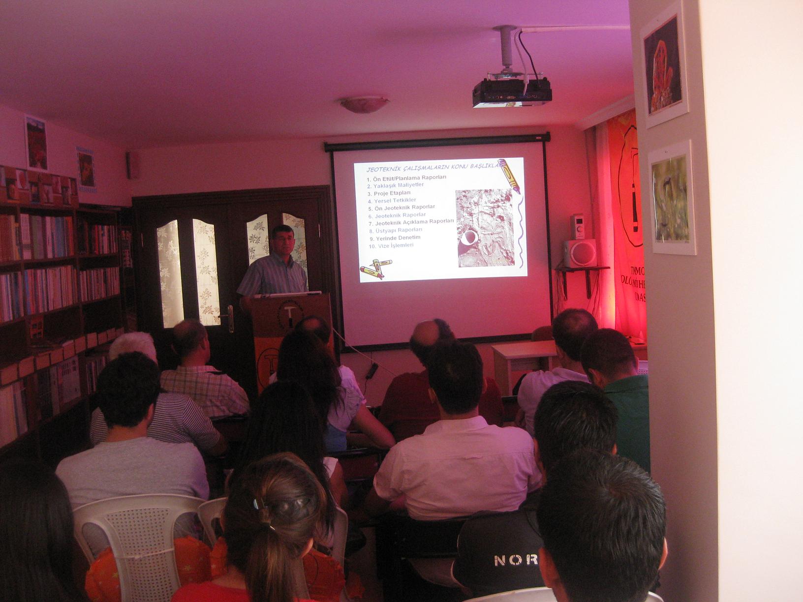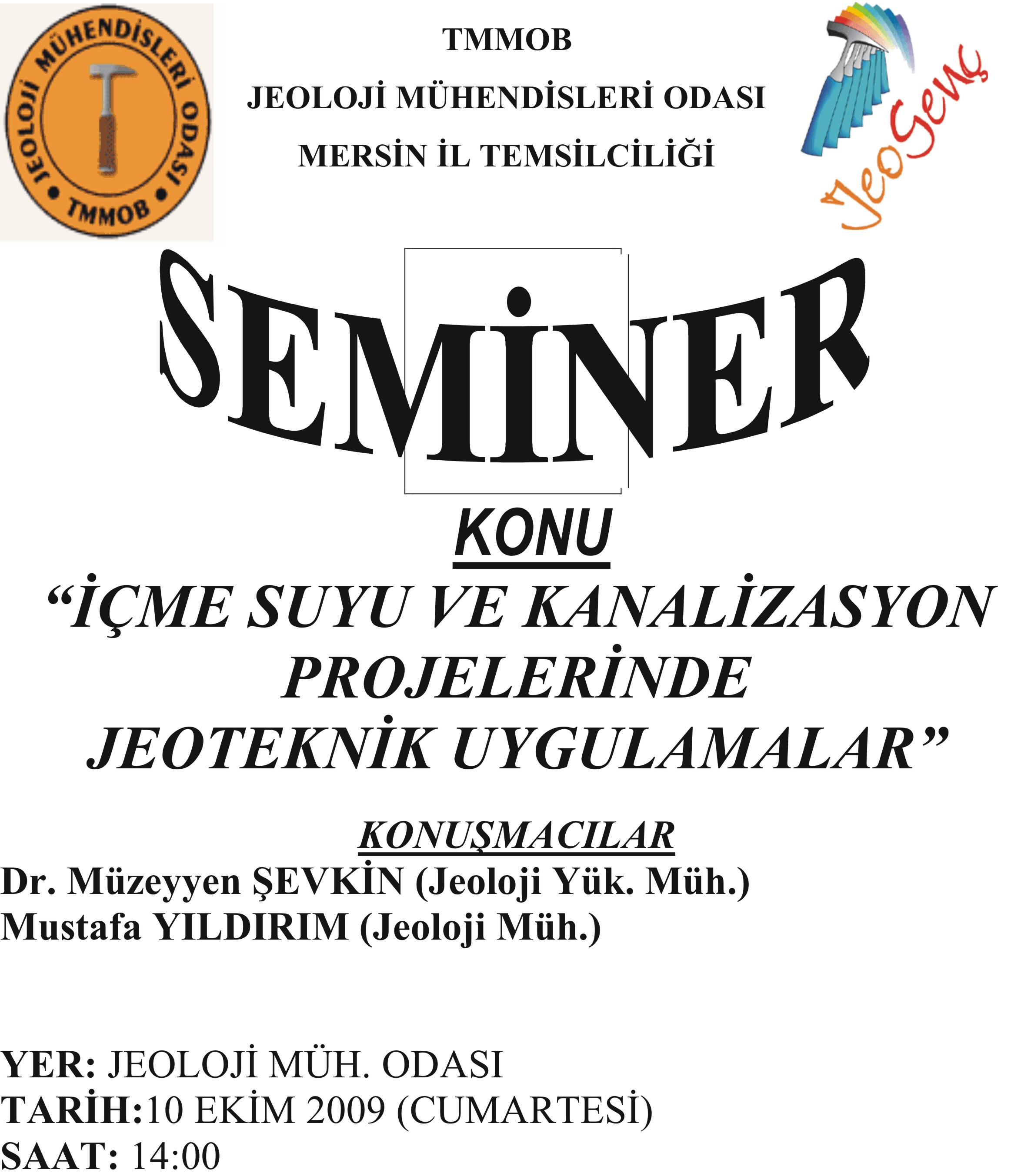 Seminer 10.10.2009 tarihinde Mersin İl Temsilciliğinde düzenlenmiştir. Mustafa YILDIRIM İçme suyu ve Kanalizasyon Etütleri ve Ön Etütlerde yer alan Jeolojik - Jeoteknik çalışmaları kapsamlı bir biçimde anlatmıştır. Müzeyyen ŞEVKİN, Jeoteknik Etüt aşaması tamamlanmış İçme Suyu ve Kanalizasyon işlerinin uygulamasında klas, şev, iksa türleri, yataklama ve gömlekleme gibi mesleğimiz uygulama alanları hakkında bilgi vermiştir.