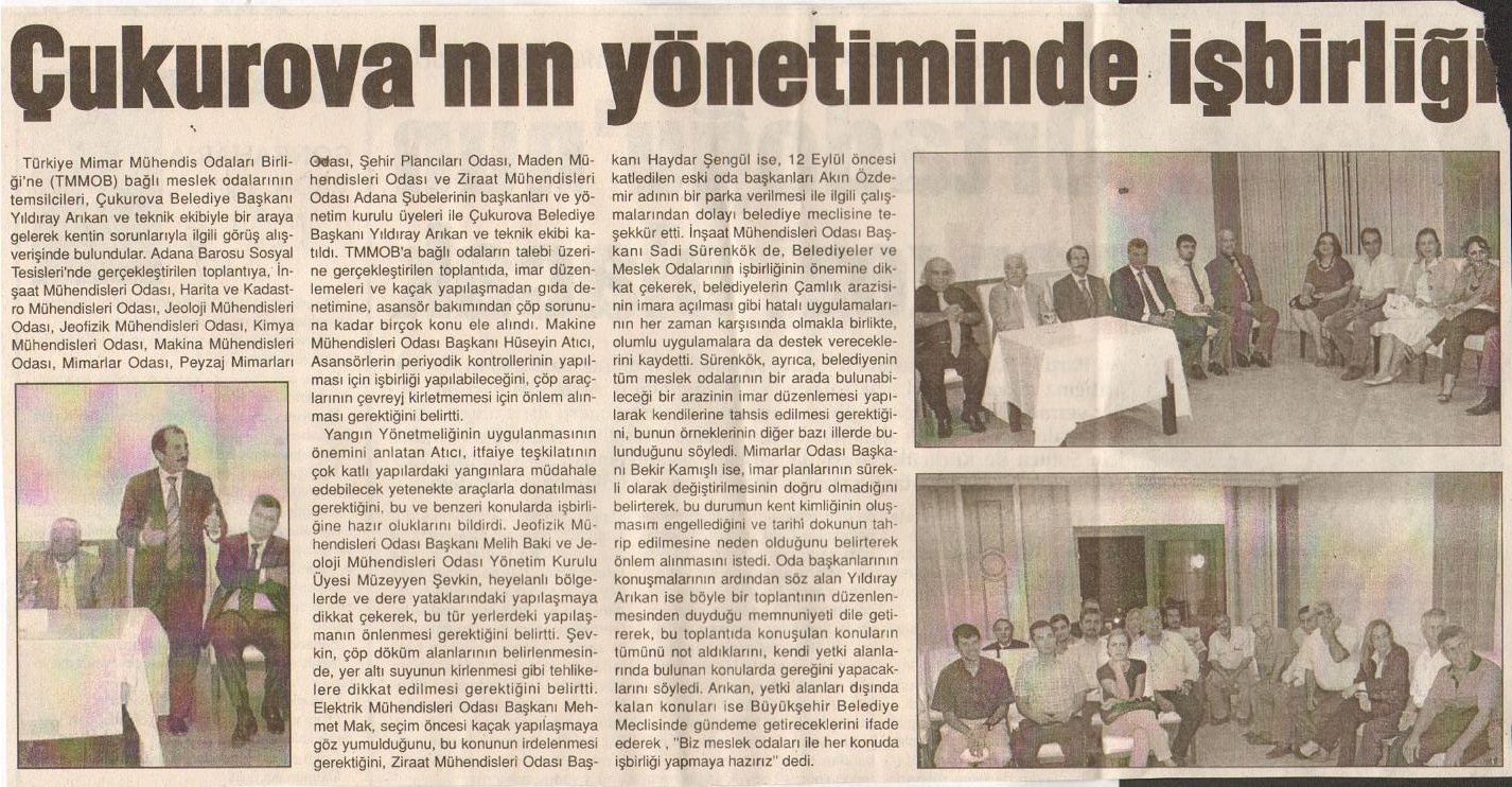 Adana‘da bulunan Türk Mimar Mühendis Odaları Birliği‘ne (TMMOB) bağlı meslek odalarının temsilcileri, Çukurova Belediye Başkanı Yıldıray ARIKAN ve teknik ekibiyle bir araya gelerek kentin sorunlarıyla ilgili görüş alışverişinde bulunmuşlardır. Toplantıya Şubemiz adına Yönetim Kurulu Üyesi Müzeyyen ŞEVKİN ve Mustafa YILDIRIM katılmıştır.