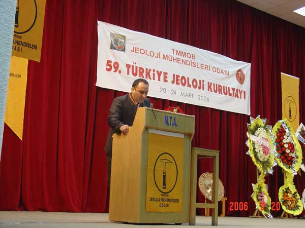 1947 yılında Türkiye Jeoloji kurumu tarafından başlatılan ve odamız tarafından devam ettirilen 59. Kurultayımızın bu yıl açılışını Kurultay Başkanı Aral OKAY yaptı. Aral OKAY yaptığı konuşmada; kurultayların ülkemiz yer bilimleri camiasının en büyük bilimsel toplantısı olduğunu vurgulayarak ülkemizdeki ve dünyadaki jeoloji eğitimindeki gelişmeleri aktardı. Daha sonra söz alan Oda Yönetim Kurulu Başkanı İsmet CENGİZ,ülkemiz mesleğimiz  meslektaşlarımızın ekonomik demokratik talepleri ile meslek alanlarımızda yaşanan sorunları ve mesleğimizle ilintili yasal düzenlemeler konusunda odamız görüşlerini aktardı. TMMOB Başkanı Mehmet SOĞANCI yaptığı konuşmada, 80’li yıllardan itibaren enerjiden haberleşmeye, eğitimden sağlığa tarımdan sosyal güvenliğe kadar tüm alanlarda yapısal bir değişim programına tabii tutulduğunu, Ülkede sanayi yatırımının azaldığını çiftçinin tarımdan uzaklaştırıldığını ve işsizliğin artığına dikkat çeken başkan,yaşanan ekonomik krizlerin boyutlarının yoksullaşma sürecini kronik hale getirdiğini bu durumdan mühendislerin de etkilendiğini belirtti.