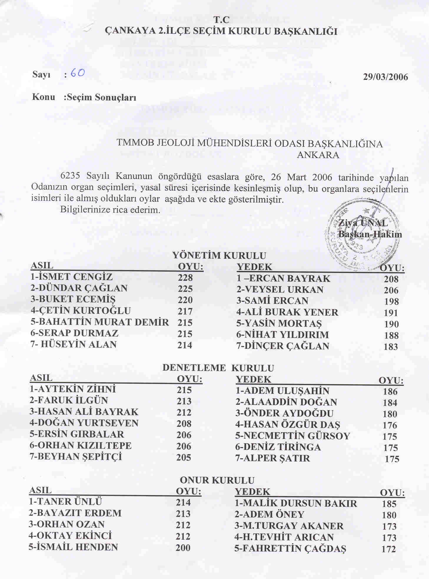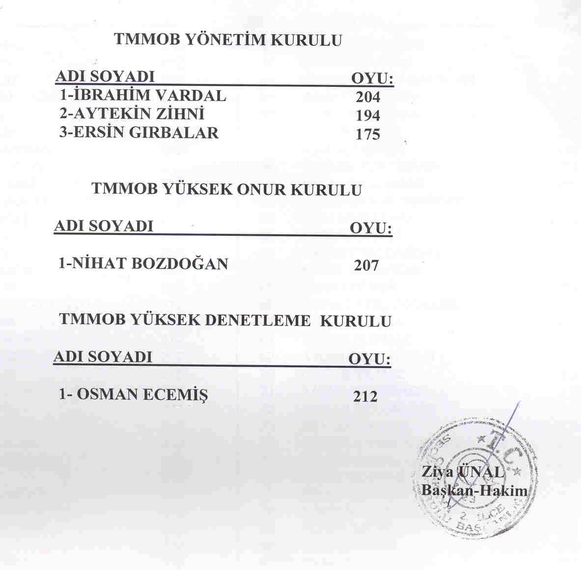 26 MART 2006 TARİHİNDE ODAMIZDA YAPILAN ODA VE TMMOB ÜST KURUL ORGAN SEÇİMLERİNİN SEÇİM KURULU TARAFINDAN KESİNLEŞEN SONUÇLARI