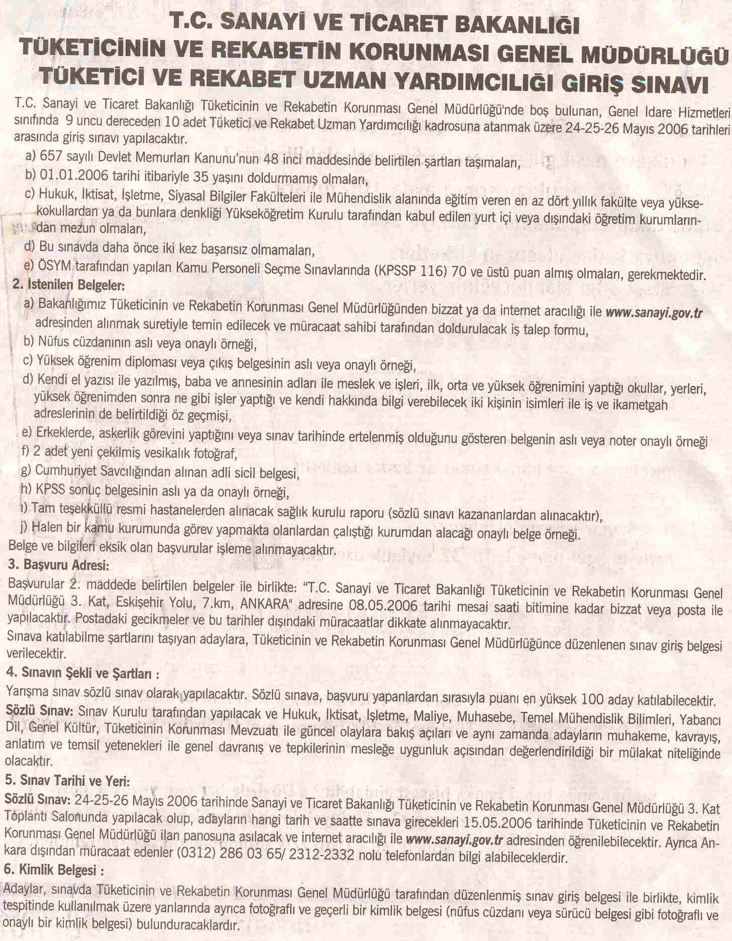 T.C. Sanayi ve Ticaret Bakanlığı Tüketicinin ve Rekabetin Korunması Genel Müdürlüğü'nde boş bulunan, Genel İdare Hizmetleri sınıfında 9 uncu dereceden 10 adet Tüketici ve Rekabet Uzman Yardımcılığı kadrosuna atanmak üzere 24-25-26 Mayıs 2006 tarihleri arasında giriş sınavı yapılacaktır.