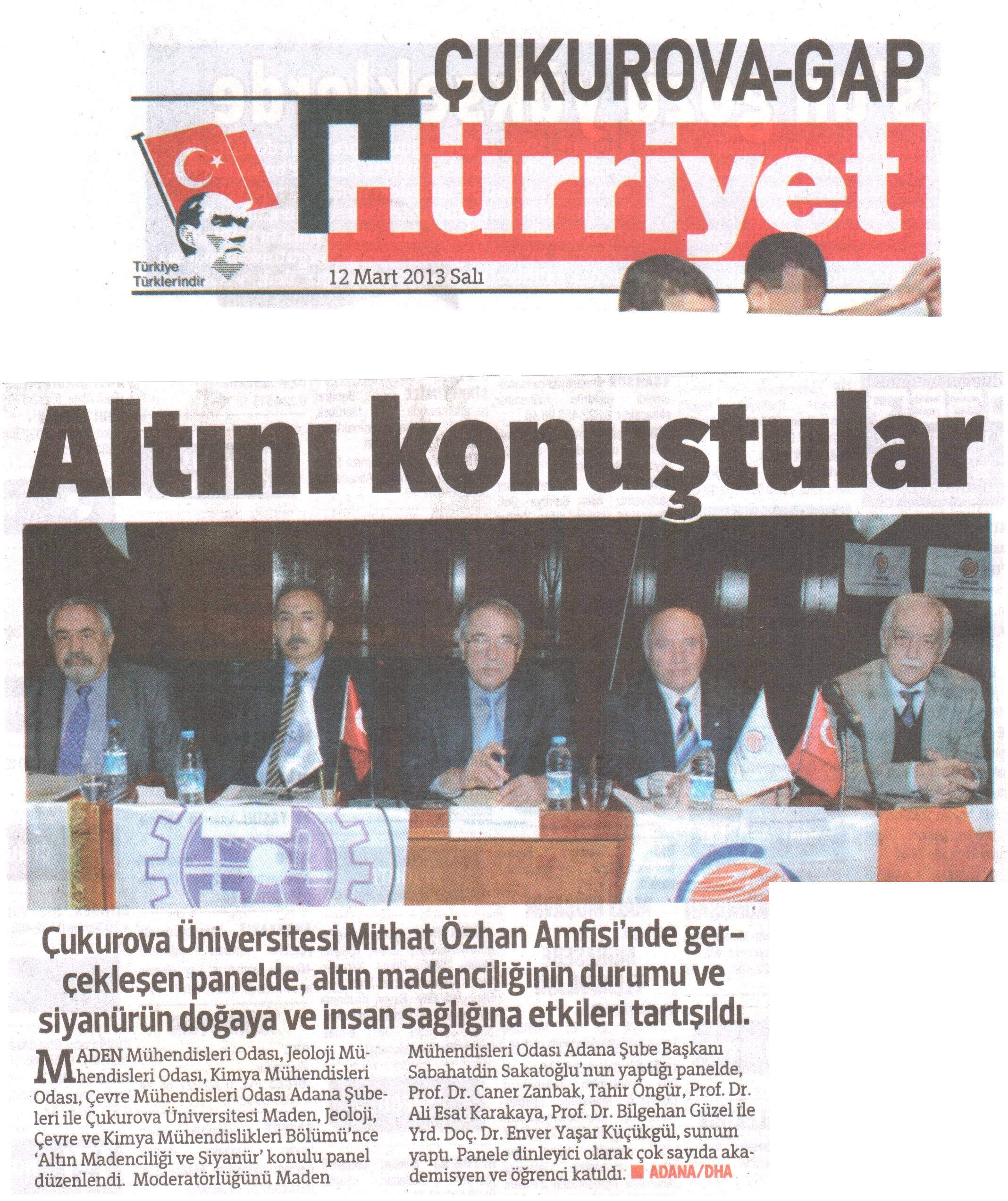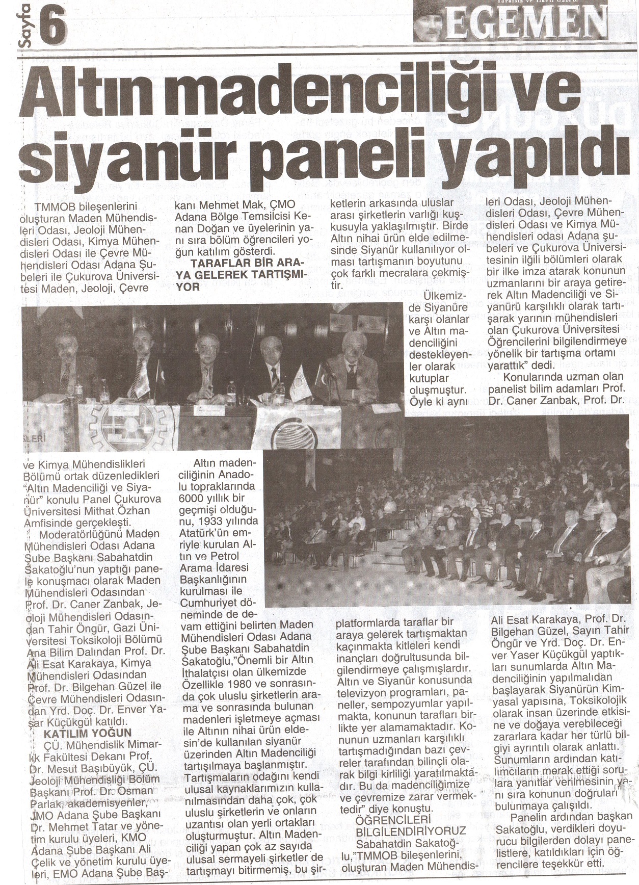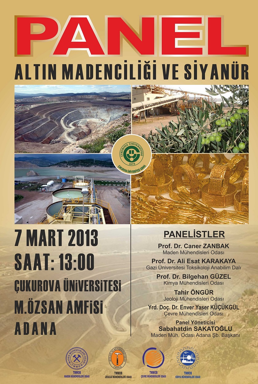 Prof. Dr. Caner ZAMBAK (Maden Mühendisleri Odası), Tahir ÖNGÜR (Jeoloji Mühendisleri Odası), Prof. Dr. Bilgehan GÜZEL (Kimya Mühendisleri Odası), Yard. Doç. Dr. Enver Yaşar KÜÇÜKGÜL (Çevre Mühendisleri Odası) ve Gazi Üniversitesi Toksikoloji Bölümü Ana Bilim Dalı Prof. Dr. Ali Esat KARAKAYA‘nın panelist olaarak katıldığı panelde; Altın madenciliğinin dünü bugünü ile siyanürün doğaya ve insan sağlığına etkileri tartışıldı. Panele; Ç.Ü. Mühendislik Mimarlık Fakültesi Dekanı, ilgili bölümlerin bölüm başkanları ve öğretim görevlileri, meslek odaları yönetim kurulu ve üyeleri, MTA bölge müdürü ve çok sayıda bölüm öğrencileri katıldı.