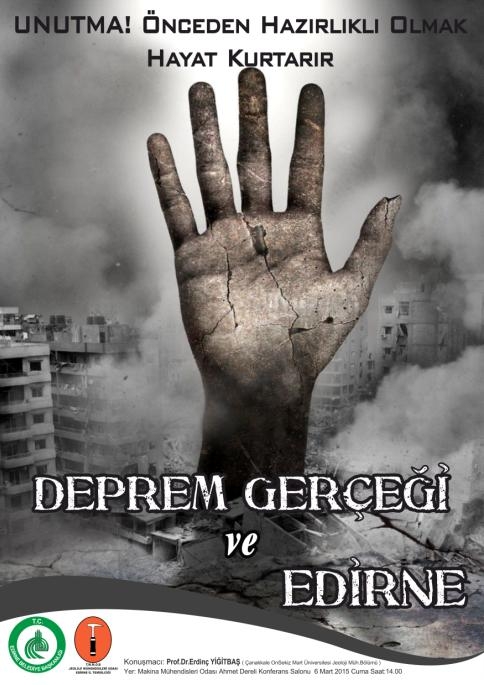 1-7 Mart 2015 tarihleri arasında düzenlenen ‘‘Deprem Haftası‘‘ etkinlikleri çerçevesinde TMMOB Jeoloji Mühendisleri Odası Edirne İl Temsilciliği ve Edirne Belediye Başkanlığı işbirliğiyle, Çanakkale Onsekiz Mart Üniversitesi Jeoloji Mühendisliği Bölümünden Prof. Dr. Erdinç YİĞİTBAŞ‘ın konuşmacı olarak katıldığı ‘‘Deprem Gerçeğive Edirne‘‘ konulu bir konferans düzenlenecektir.
