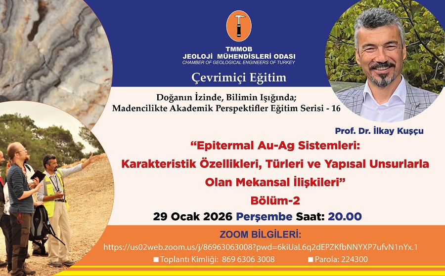 Madencilik Komisyonumuz tarafından Doğanın İzinde, Bilimin Işığında; Madencilikte Akademik Perspektifler Eğitim Serisi kapsamında "Epitermal Au-Ag Sistemleri: Karakteristik Özellikleri, Türleri ve Yapısal Unsurlarla olan Mekansal İlişkileri-Bölüm-2" başlıklı çevrimiçi eğitim düzenlenecektir.