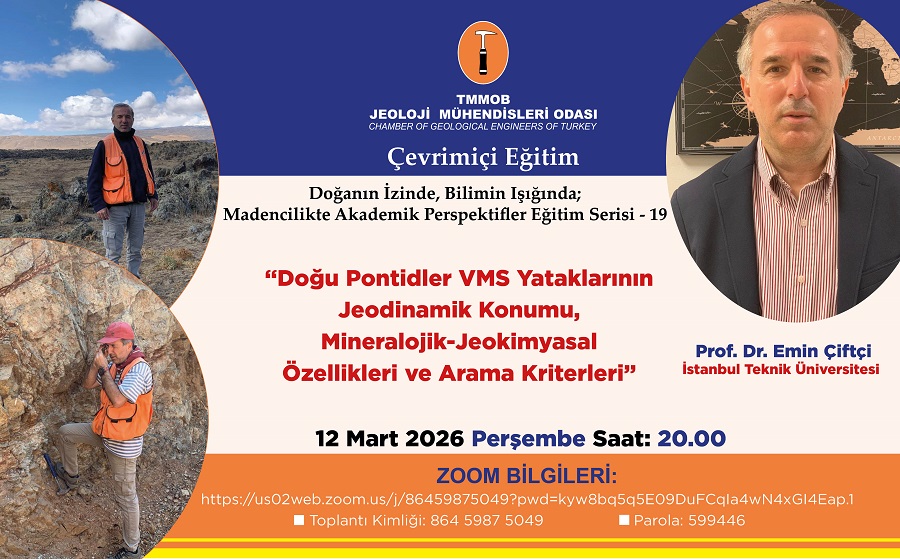 Madencilik Komisyonumuz tarafından Doğanın İzinde, Bilimin Işığında; Madencilikte Akademik Perspektifler Eğitim Serisi kapsamında "Doğu Pontidler VMS Yataklarının Jeodinamik Konumu, Mineralojik-Jeokimyasal Özellikleri ve Arama Kriterleri" başlıklı çevrimiçi eğitim düzenlenecektir.